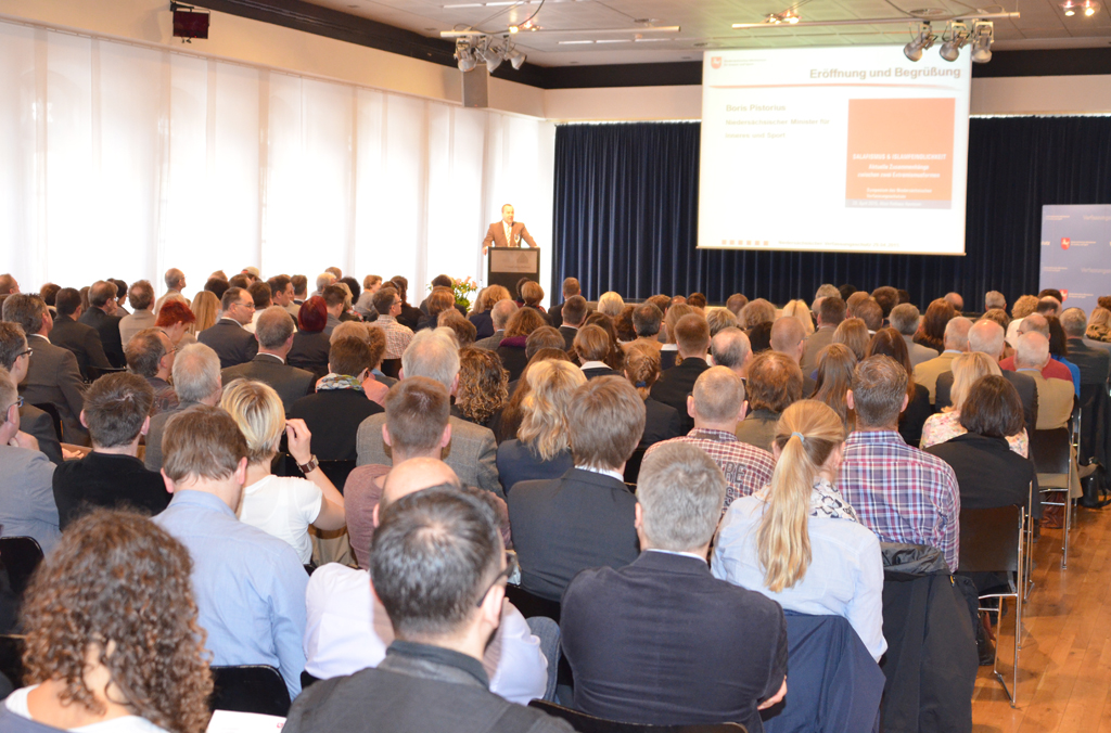 Niedersachsens Minister für Inneres und Sport, Boris Pistorius, betonte zu Beginn der Veranstaltung, der Salafismus sei eine menschenverachtende und intolerante Ideologie. Unter den vier Millionen Muslimen, die in Deutschland lebten, würden Salafisten nur eine kleine Minderheit ausmachen, sie dürften daher keinesfalls mit der gesamten Religion gleichgesetzt werden – so, wie es Islamgegner zuletzt immer wieder versucht hätten. „Trotz aller Unterschiede haben Salafisten und diejenigen aus der Mitte unserer Gesellschaft, die gegen den Islam Stimmung machen, damit eines gemeinsam: Beide Gruppen stellen sich gegen eine offene und tolerante Gesellschaft, gegen die Grundwerte unserer freiheitlichen Demokratie. Und das dürfen wir auf keinen Fall hinnehmen oder zulassen“, so Minister Pistorius.