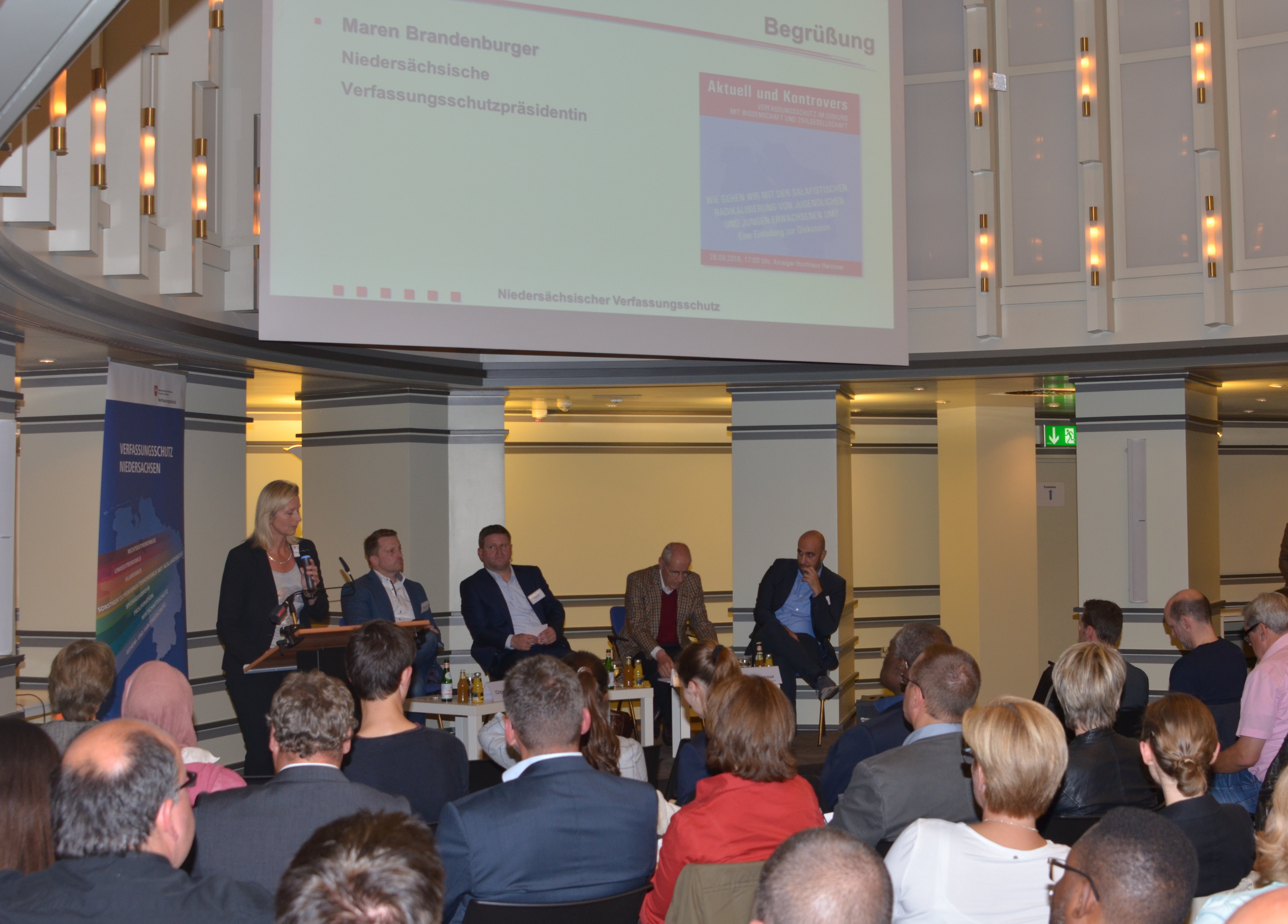Verfassungsschutzpräsidentin Maren Brandenburger konnte zur Veranstaltung am Montag, den 26.09.2016 im Anzeiger-Hochhaus Hannover mehr als 130 Gäste aus den Bereichen Schule, Jugendpflege, Religion, Politik und Sicherheitsbehörden begrüßen.