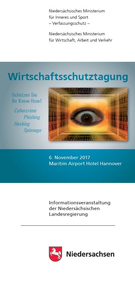 Am 6. November 2017 veranstaltet das Niedersächsische Ministerium für Inneres und Sport, Abteilung Verfassungsschutz, gemeinsam mit dem Niedersächsischen Ministerium für Wirtschaft, Arbeit und Verkehr die diesjährige Wirtschaftsschutztagung.