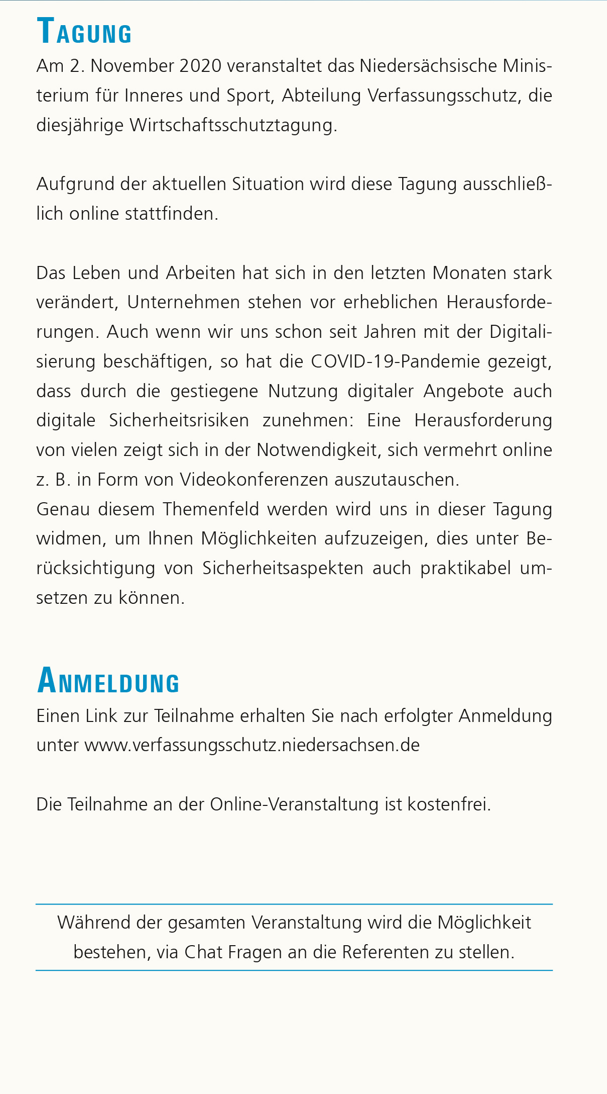 Am 2. November 2020 veranstaltet das Niedersächsische Ministerium für Inneres und Sport, Abteilung Verfassungsschutz die diesjährige Wirtschaftsschutztagung als Online-Informationsveranstaltung.