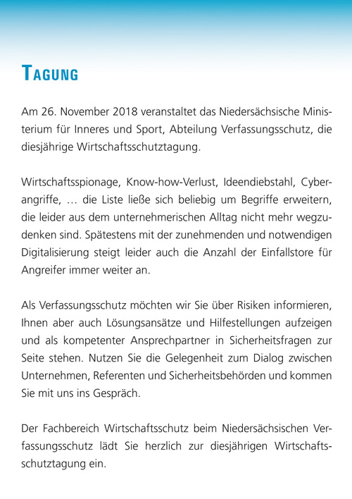 Am 26.11.2018 fand die 17. Wirtschaftsschutztagung des Niedersächsischen Verfassungsschutzes statt. Insgesamt 190 Teilnehmenden, größtenteils aus Niedersächsischen Unternehmen sowie einzelnen Vertreterinnen und Vertretern von Sicherheitsbehörden und Ministerien, wurde ein interessantes und abwechslungsreiches Programm geboten, das Aspekte der Sensibilisierung und des Schutzes vor Cyberangriffen aus unterschiedlichen Richtungen beleuchtete.