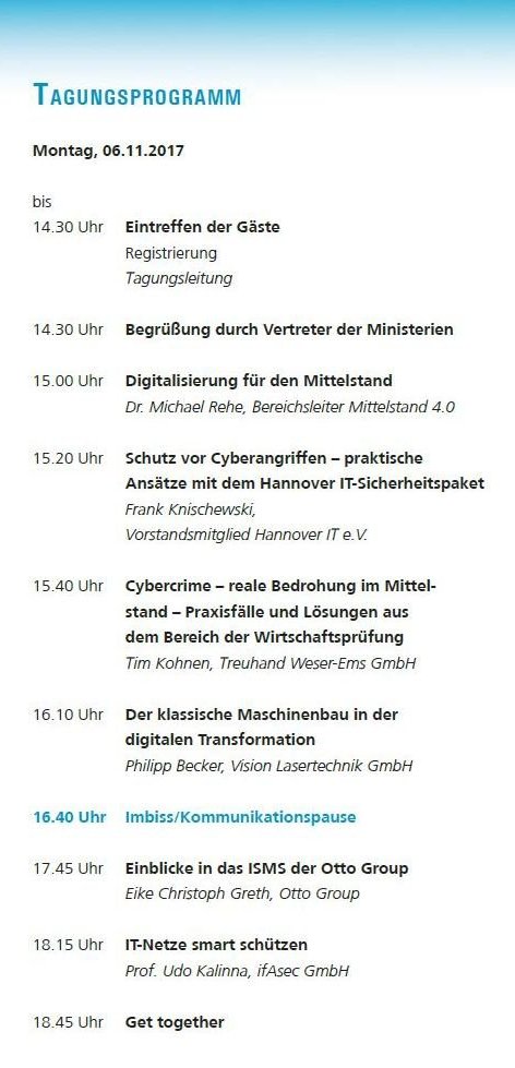 Insgesamt mehr als 300 Teilnehmern, größtenteils aus Niedersächsischen Unternehmen sowie einzelnen Vertretern von Sicherheitsbehörden und Ministerien wurde ein interessantes und abwechslungsreiches Programm geboten,das Aspekte der Sensibilisierung und des Schutzes vor Cyberangriffen aus unterschiedlichen Richtungen beleuchtete.