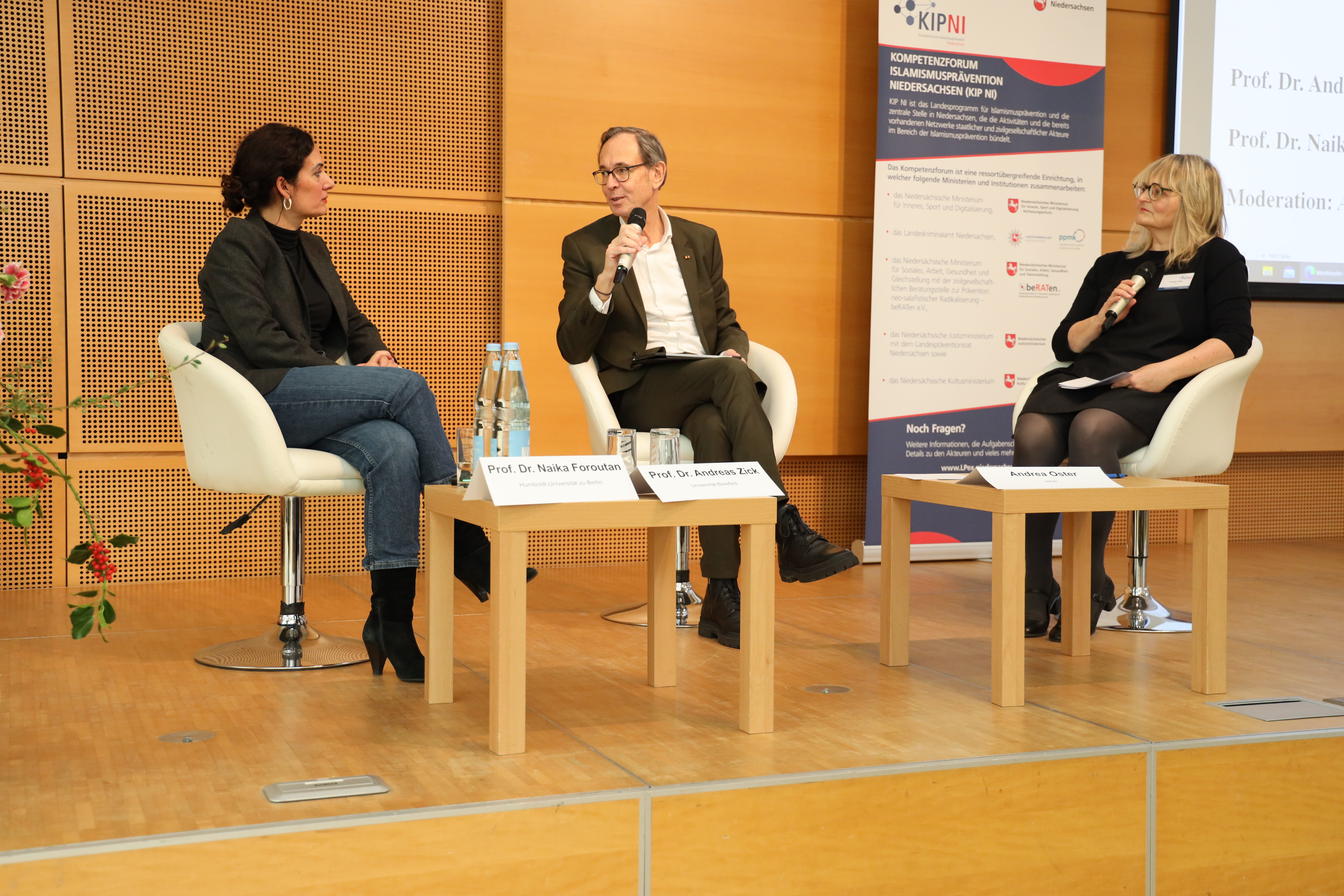 In dem anschließenden, von Andrea Oster, Journalistin und Moderatorin beim WDR 5, moderierten Podiumsgespräch veranschaulichten Zick und Foroutan, dass die aktuell zu beobachtenden Radikalisierungsprozesse durch internationale politische Dynamiken verstärkt würden. Zudem betonten sie den Einfluss sozialer Medien, bezüglich derer jungen Menschen oftmals die Fähigkeit fehle, die Inhalte einordnen zu können. Foroutan forderte mehr Transparenz seitens staatlicher Stellen im Umgang mit Desinformation, während Zick betonte, dass vor allem Kinder und Jugendliche besser auf digitale Gefahren vorbereitet werden müssten. Einig waren sich beide Diskutierenden, dass Verbote sozialer Medien kaum Wirkung entfalten würden. Stattdessen bedürfe es mehr ansprechbarer Vertrauenspersonen, insbesondere mit Migrationshintergrund (z. B. aus den Bereichen der Sozialarbeit oder der Polizei), im sozialen Raum, um Zugang zu jungen Menschen zu schaffen und ihnen Orientierung und Unterstützung bieten zu können. Diese Einschätzungen wurden auch in den Publikumsfragen bestätigt, die sich überwiegend auf die Rolle sozialer Medien bezogen.