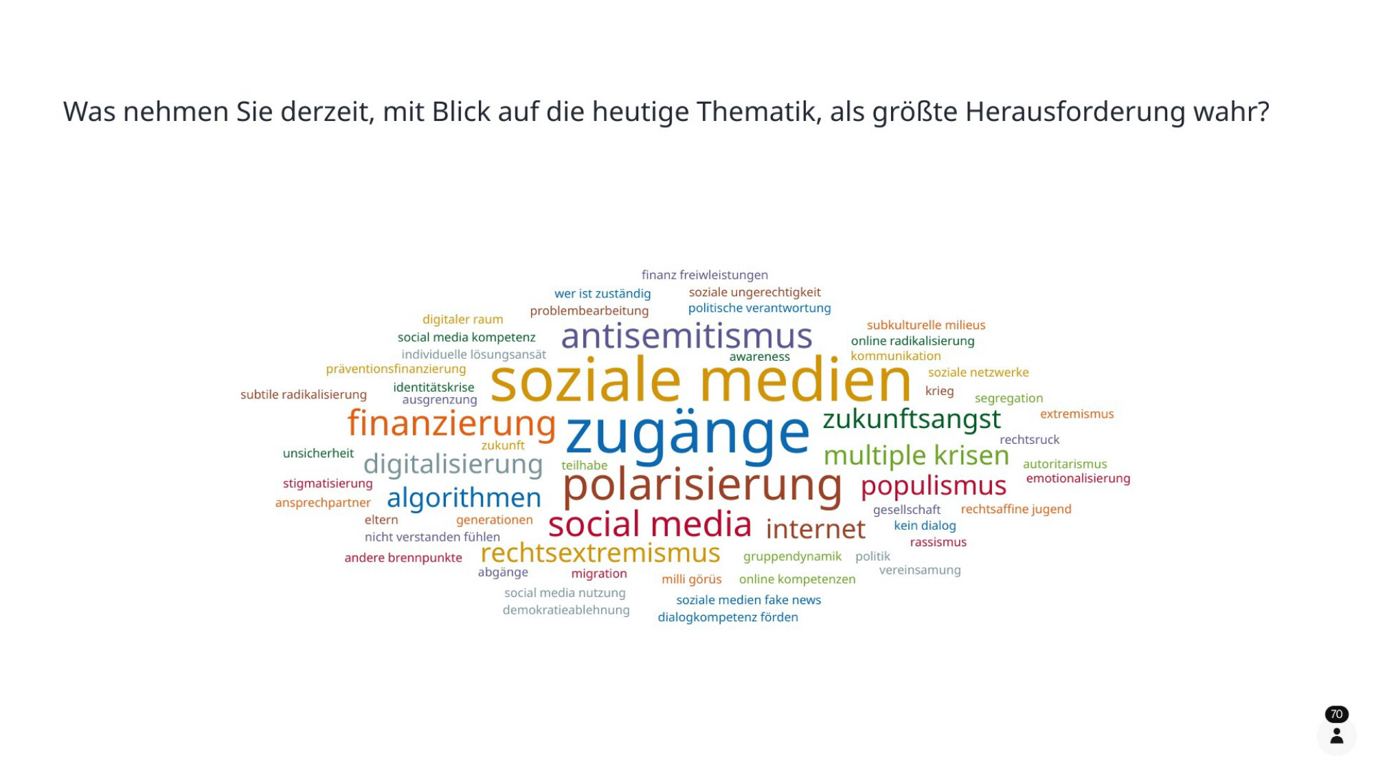 Im Verlauf der Tagung konnten die Tagungsteilnehmerinnen und -teilnehmer über Mentimeter-Abfragen ihre Eindrücke einbringen. Es wurde deutlich, dass auch aus dem Publikum die derzeit größte Herausforderung in der Islamismusprävention insbesondere im Umgang mit den Sozialen Medien gesehen wird. Mit Sorge wurde darüber hinaus die wahrgenommene Polarisierung der Gesellschaft genannt sowie als Herausforderung der Zugang zu jungen Menschen. Die Wichtigkeit guter Netzwerke in der Extremismusprävention wurde abschließend als wichtiges Fazit von vielen Teilnehmenden formuliert.