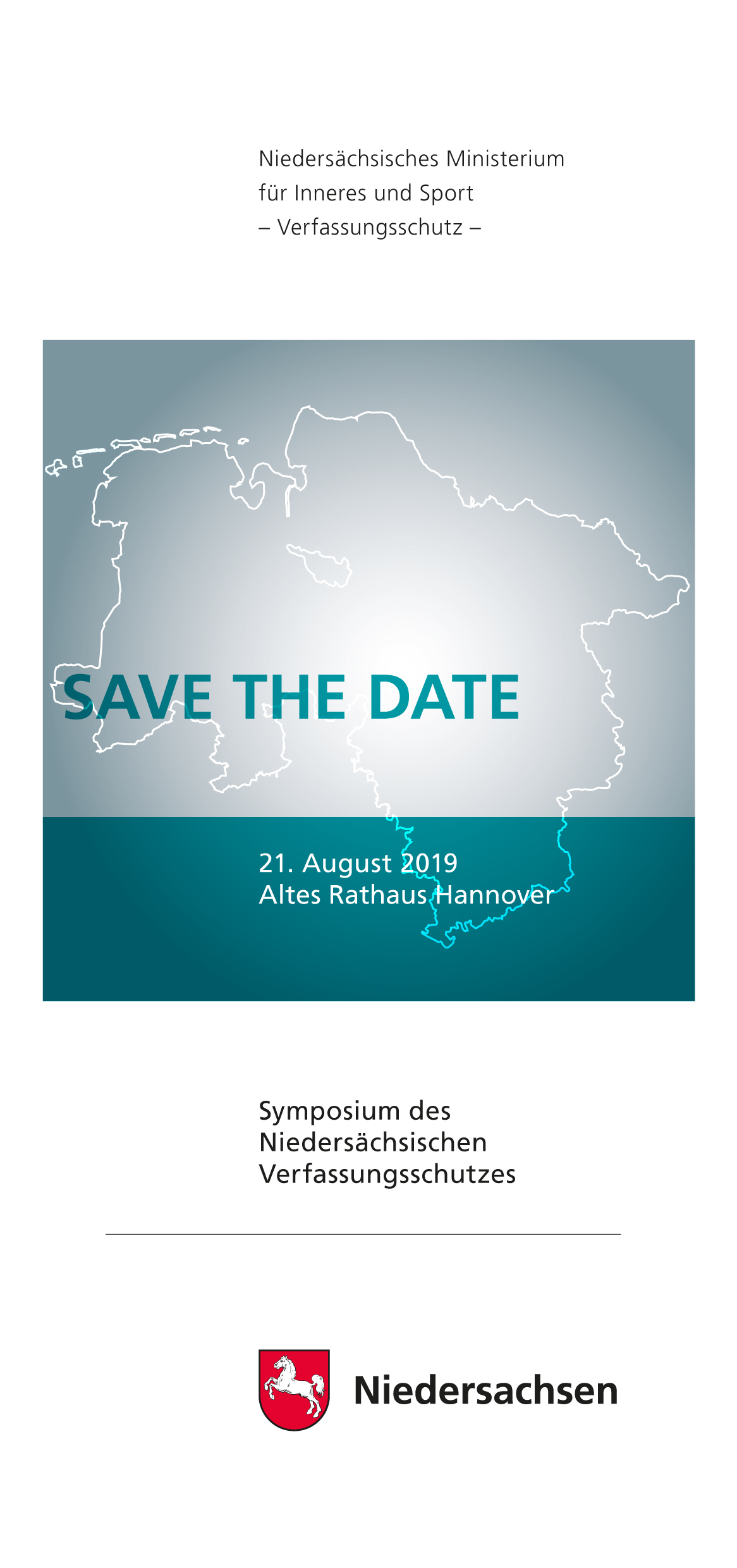 Der Niedersächsische Verfassungsschutz möchte Sie schon heute auf sein nächstes Symposium am 21.08.2019 in Hannover zum Thema "Jugendkultur und Extremismus" hinweisen.