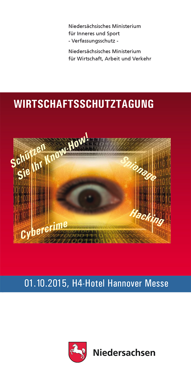 Am 1. Oktober 2015 veranstaltet der Niedersächsische Verfassungsschutz seine diesjährige Wirtschaftsschutztagung im H4-Hotel in Hannover Messe. Zum zweiten Mal findet die Wirtschaftsschutztagung gemeinsam mit dem Niedersächsischen Ministerium für Wirtschaft, Arbeit und Verkehr statt. Innenminister Boris Pistorius und Wirtschaftsminister Olaf Lies werden zusammen mit Experten und Betroffenen Risiken aufzeigen und auf aktuelle Gefahrensituationen zum Thema „Daten- und Informationssicherheit“ aufmerksam machen.