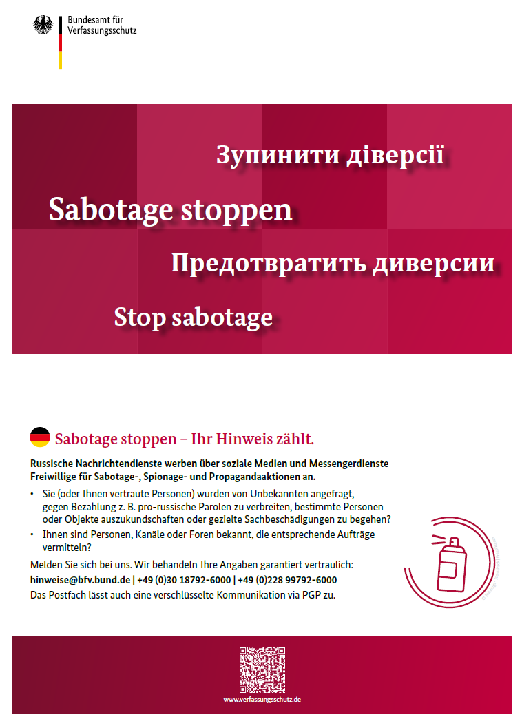 Das Bundesamt für Verfassungsschutz hat dazu einen Flyer „Sabotage stoppen“ veröffentlicht, der besonders betroffene Personengruppen in deutscher, ukrainischer, englischer und russischer Sprache für entsprechende Anwerbeversuche über soziale Medien und Messengerdienste sensibilisiert. Unter anderem sind dabei folgende Fragestellungen relevant: